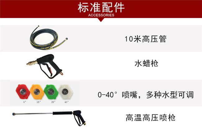 1、10米高压管 2、0-40º喷头 3、意大利高压枪 4、水蜡枪