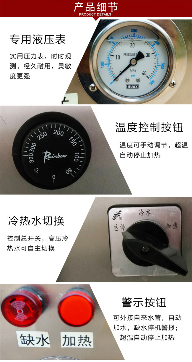 6. 针对冬季严寒天气,特设防冻按钮,确保冬季使用无忧,可高压热水、高压冷水自主切换。