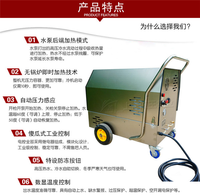 3. 带自动压力感应,开枪开泵开始加热,关枪关泵停止加热;水温超过50度(可调)上限,停止加热,低于50度(可调)自动恢复加热;缺水停机警报(可外接自来水管,自动补水)。