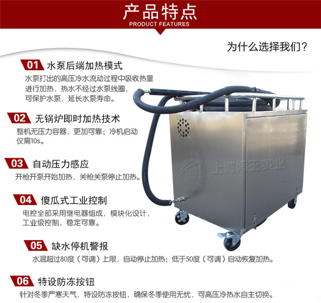 3. 带自动压力感应,开枪开泵开始加热,关枪关泵停止加热;水温超过50度(可调)上限,停止加热,低于50度(可调)自动恢复加热;缺水停机警报(可外接自来水管,自动补水)。