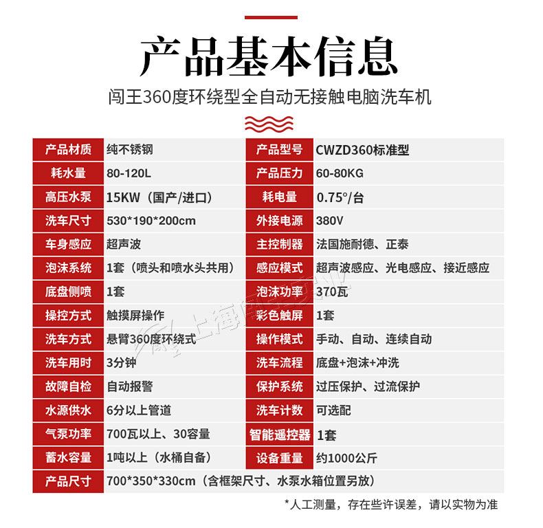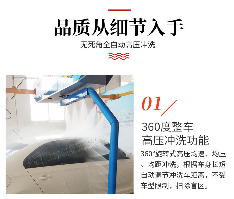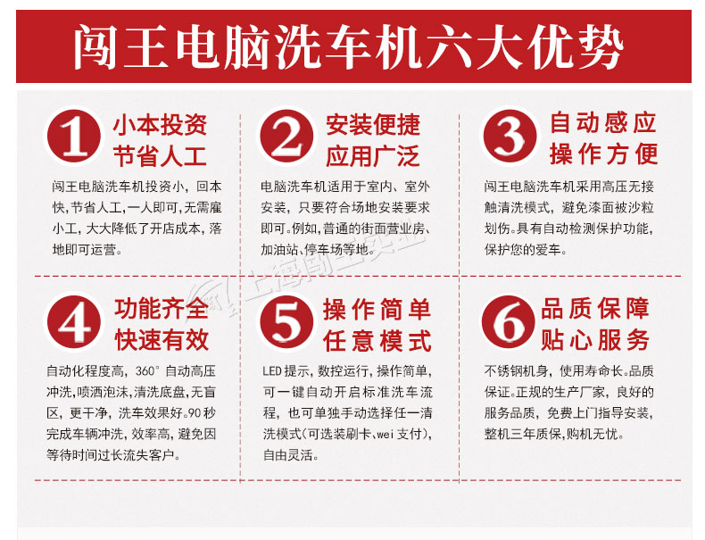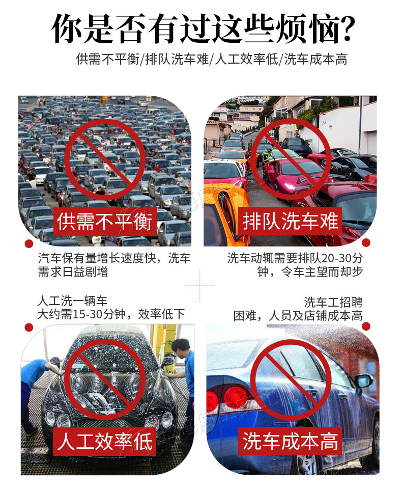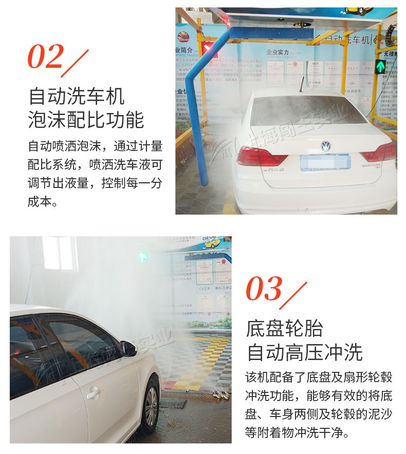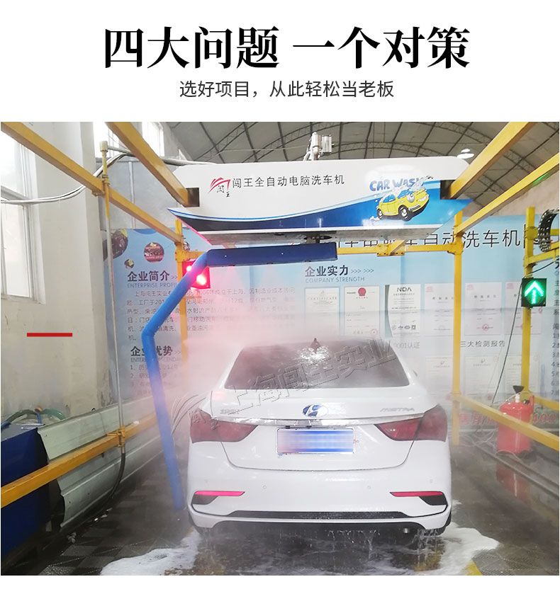 闯王标准型全自动洗车机,感应式开关,车辆经过,底喷系统自动清洗底盘,侧喷系统自动清洗轮毂,无死角。多液复用,自动喷洒泡沫,泡沫均匀覆盖到车身表面,对付顽固污渍。360°环绕型智能无接触清洗,不接触车身,对车漆不会造成伤害,无盲区,更干净。全自动洗车机优势分析,洗车速度快,大大的提升了洗车效率;节省人工,降低劳动力成本;操作方便,界面简单易懂;成本低,创造的价值高;形象好,提升店铺公信力,更容易吸引客户,留住客户;减少客户等待时间,提高客户粘性;易操作,不偷懒,24小时都可以工作,店面管理更安心。