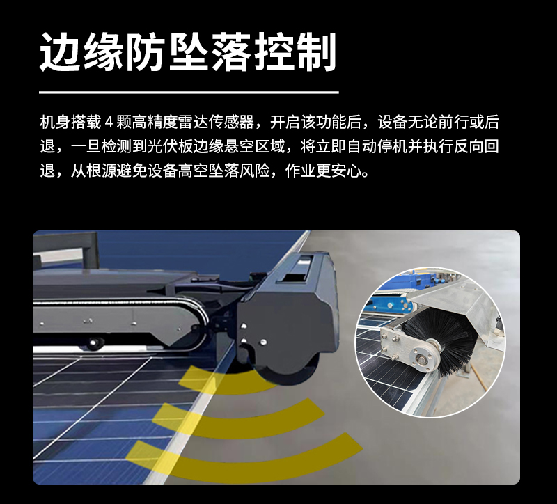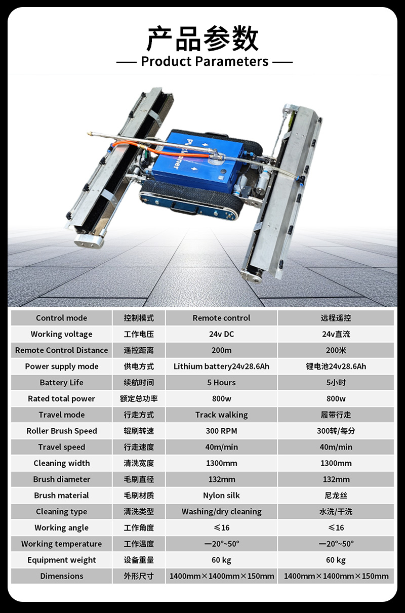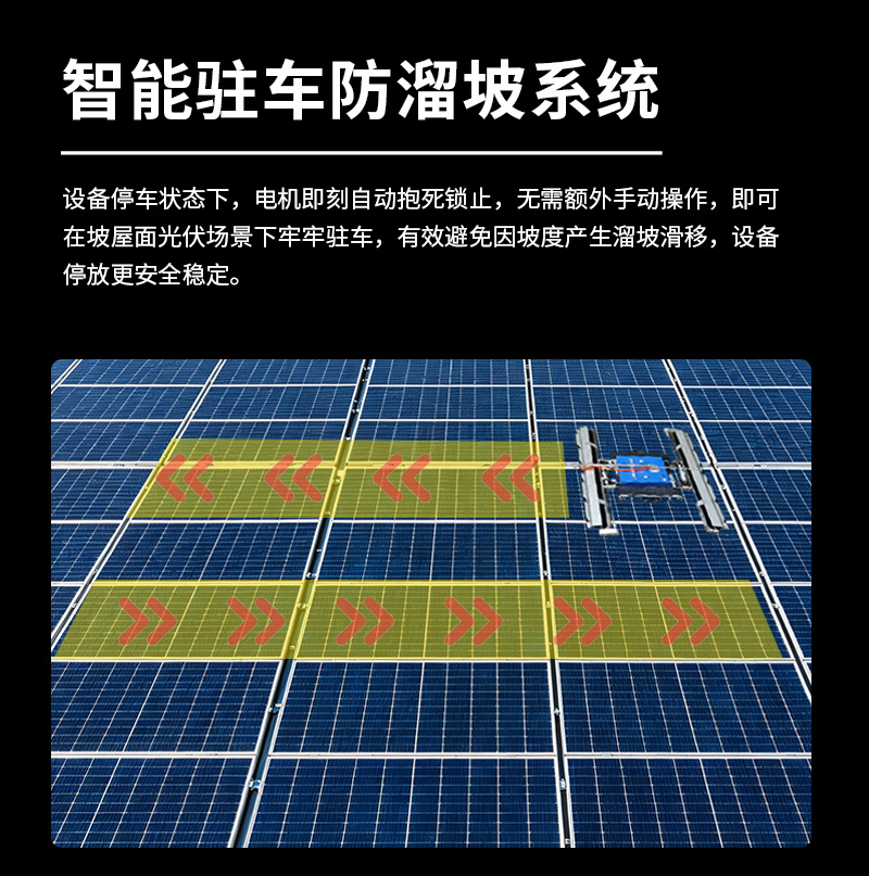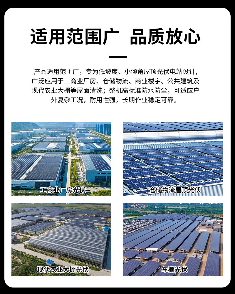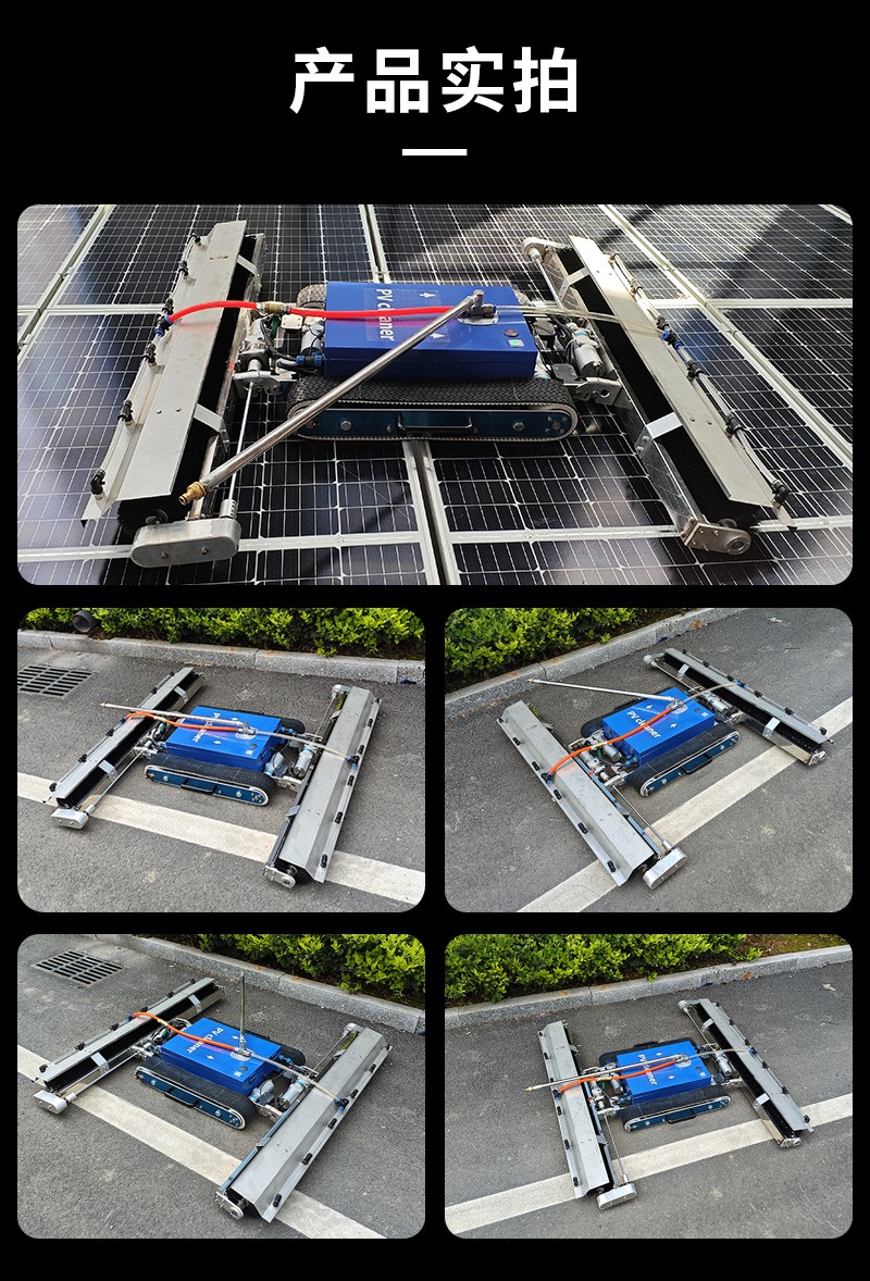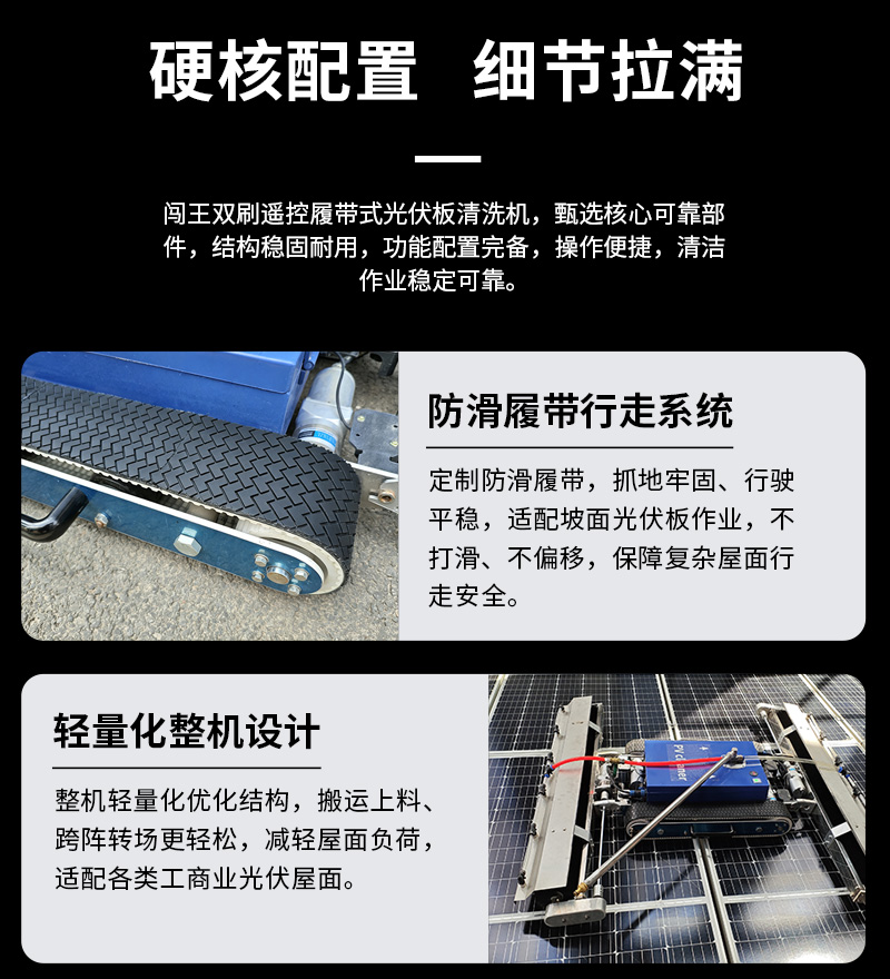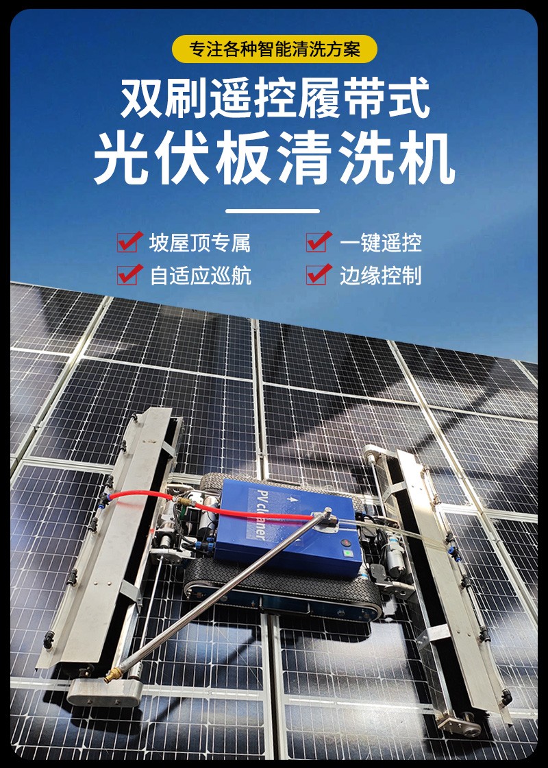 本款双头遥控履带式光伏板清洗机,聚焦低坡度坡屋顶光伏运维,创新适配小角度屋面场景。双头同步清洁效率高,遥控远程操作更安全,履带式底盘行走稳定,不损伤光伏面板,防水耐用适应户外环境,是坡屋顶光伏电站清洁、降本增效的理想设备。